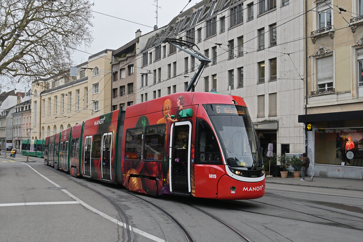 Be 6/8 Flexity 5015 mit der Manor Werbung, auf der Linie 14, überquert am 11.11.2025 die Mittlere Rheinbrücke. Aufnahme Basel.