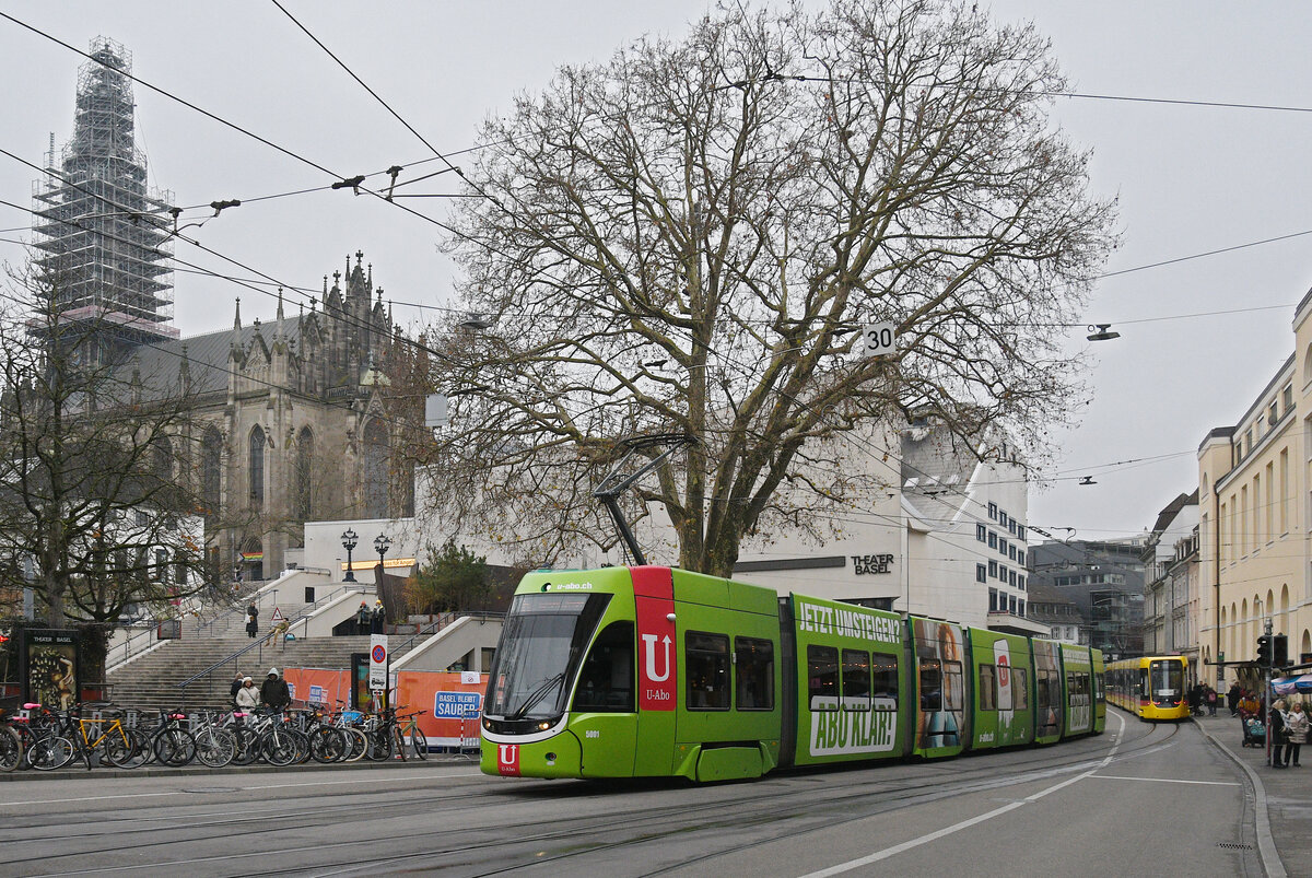 Be 6/8 Flexity 5001 mit der U-Abo Werbung, auf der Linie 6, verlässt am 01.12.2025 die Haltestelle Theater. Aufnahme Basel.
