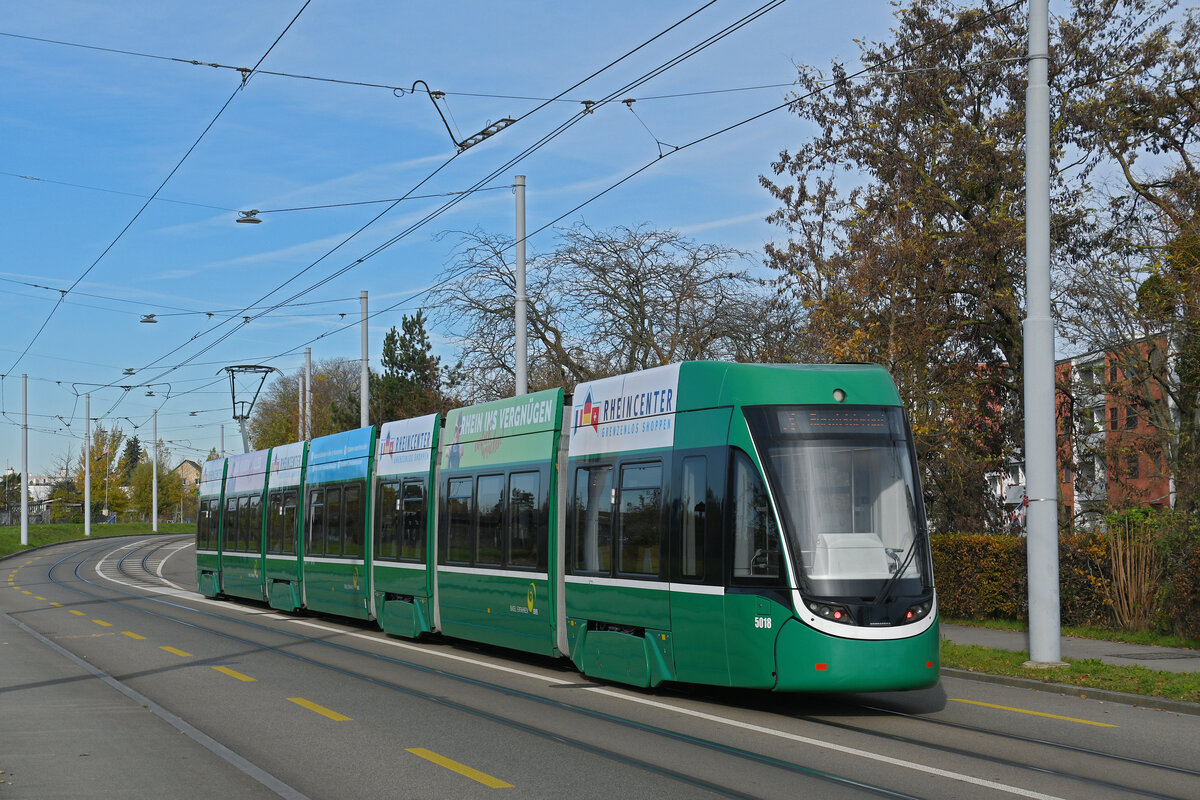Be 6/8 Flexity 5018, auf der Linie 3, fährt am 05.11.2025 zur Haltestelle Burgfelden Grenze. Aufnahme Basel.