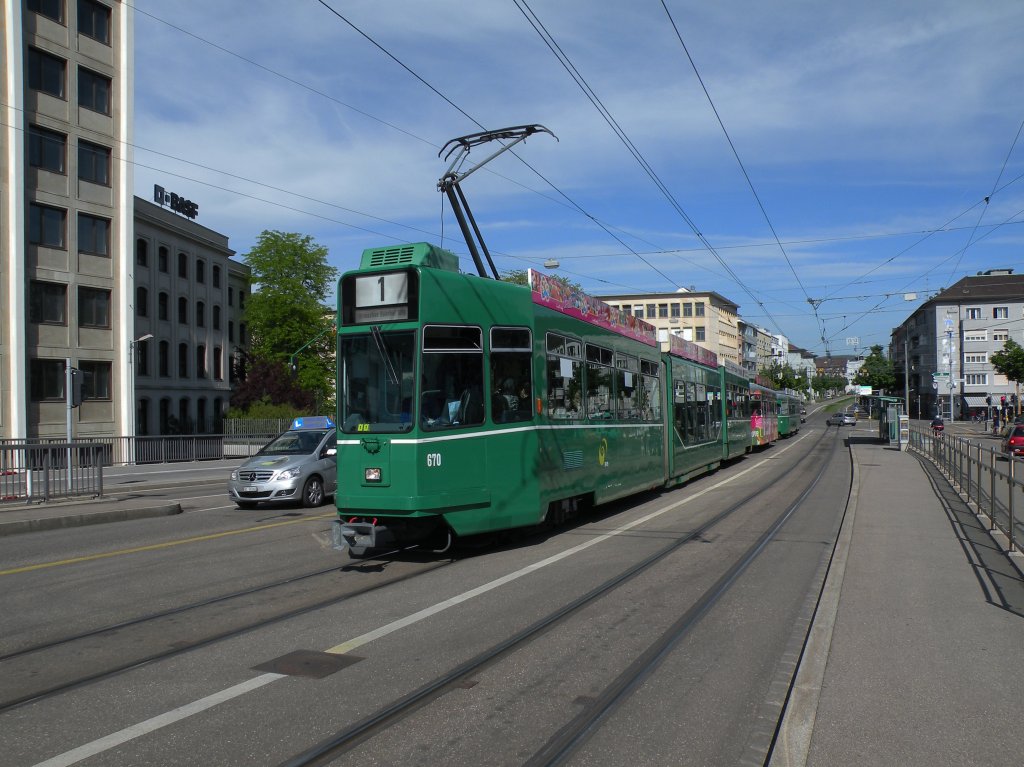 Be 4/6S mit der Betriebsnummer 670 und der B4 1447 mit der U-Abo Vollwerbung auf der Linie 1 kurz nach der Haltestelle Dreirosenbrücke. Die Aufnahme stammt vom 14.05.2012.