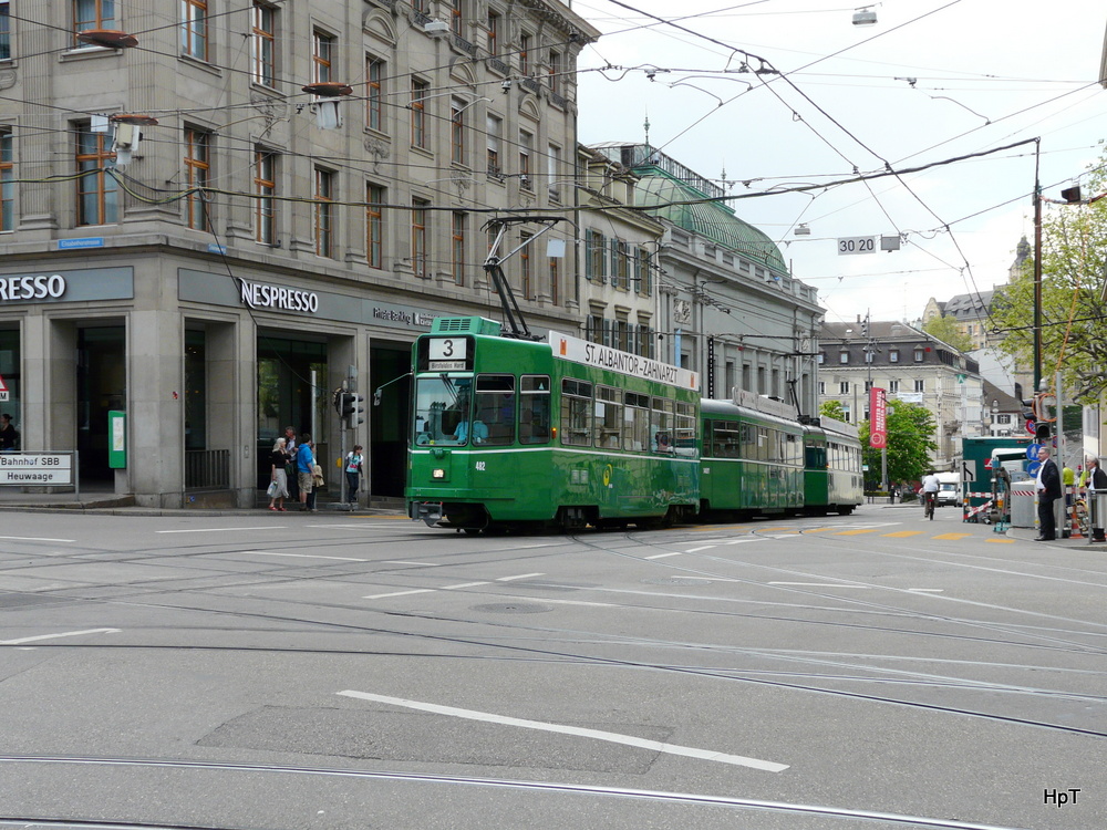 BVB - Tram Be 4/4 482 mit Beiwagen und Be 4/4 unterwegs auf der Linie 3 in Basel am 04.05.2012