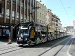Be 4/6 Flexity 6011 mit der Werbung für die Konfitüre von Zuegg, auf der wegen einer Baustelle umgeleiteten Linie 3, fährt am 07.04.2026 zur Haltestelle am Aeschenplatz. Aufnahme Basel.