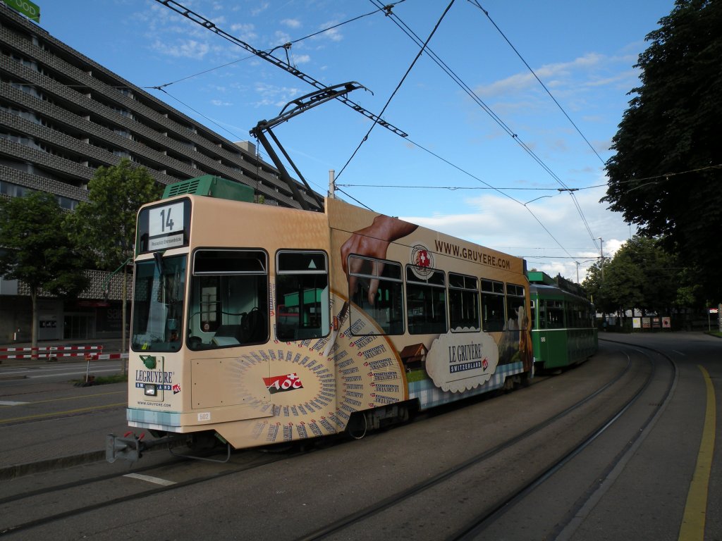 Be 4/4 mit der Betriebsnummer 502 und der Le Gruyère Vollwerbung im letzten Tageslicht an der Haltestelle St. Jakob auf der Linie 14. Die Aufnahme stammt vom 25.06.2012.