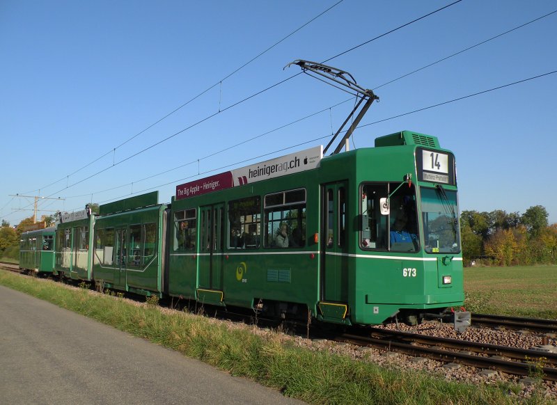 Be 4/6 S mit der Betriebsnummer 673 auf der Linie 14 fahren Richtung Lachmatt. Die Aufnahme stammt vom 19.10.2012.