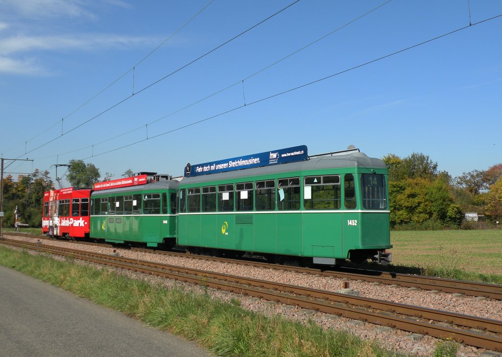 Dreiwagenzug mit dem Be 4/4 495 und der Vollwerbung für das Einkaufscenter St. Jakob Park, dem B 1449S und dem B 1452 fahren Richtung Haltestelle Rothausstrasse. Die Aufnahme stammt vom 19.10.2012.