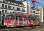 Be 4/6 Flexity 6011 mit der Werbung für die Konfitüre von Zuegg, auf der wegen einer Baustelle umgeleiteten Linie 3, fährt am 07.04.2026 zur Haltestelle am Aeschenplatz. Aufnahme Basel.
