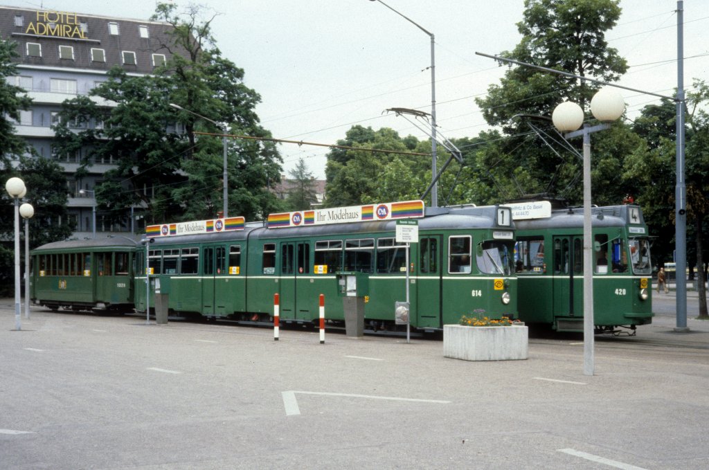 Basel BVB Tram 1 (Be 4/6 614 + B3 1328) / Tram 4 (Be 4/4 420) Messeplatz am 28. Juni 1980.