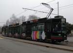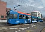 Be 4/6 Flexity 6011 mit der Werbung für die Konfitüre von Zuegg, auf der wegen einer Baustelle umgeleiteten Linie 3, fährt am 07.04.2026 zur Haltestelle am Aeschenplatz. Aufnahme Basel.
