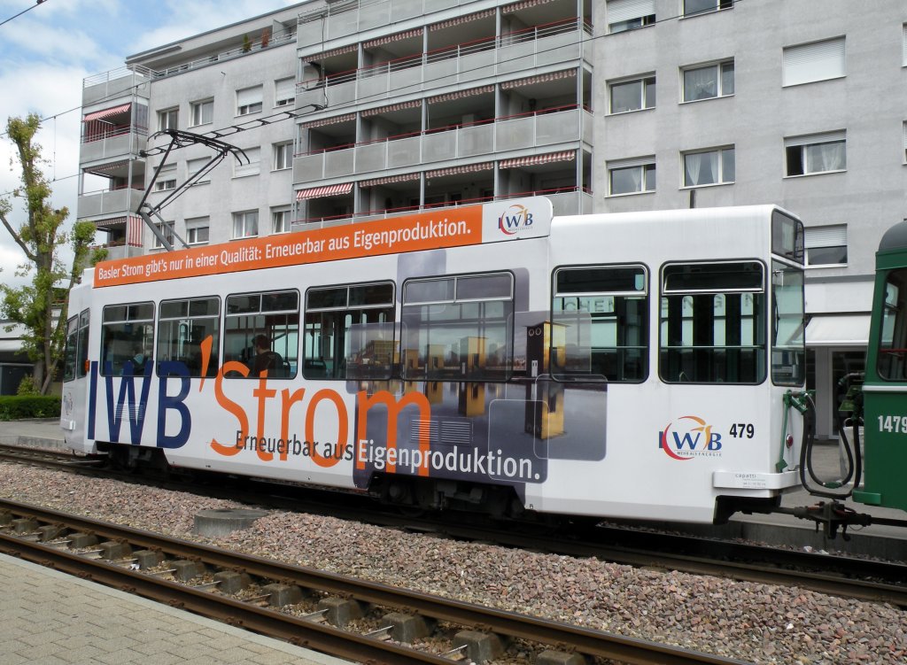 Kurz nach der Revision erhält der Be 4/4 479 wieder eine neue IWB Werbung. Vor der Revision hatte er bereits eine andere IWB Werbung. Hier sehen wir den Be 4/4 479 an der Endhaltestelle in Pratteln. Die Aufnahme stammt vom 10.06.2013.