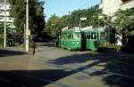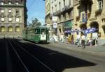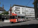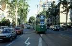 Basel, der Rhein, Sonnenhungrige und eine grüne Straßenbahn im Abendsonnenlicht. Blick von der Johanniterbrücke zur Mittleren Rheinbrücke mit dem Münster und dem Schweizer Jura im Hintergrund.