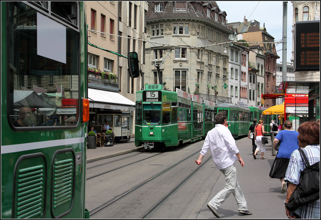 Szene an der Tram-Haltestelle Marktplatz in Basel.