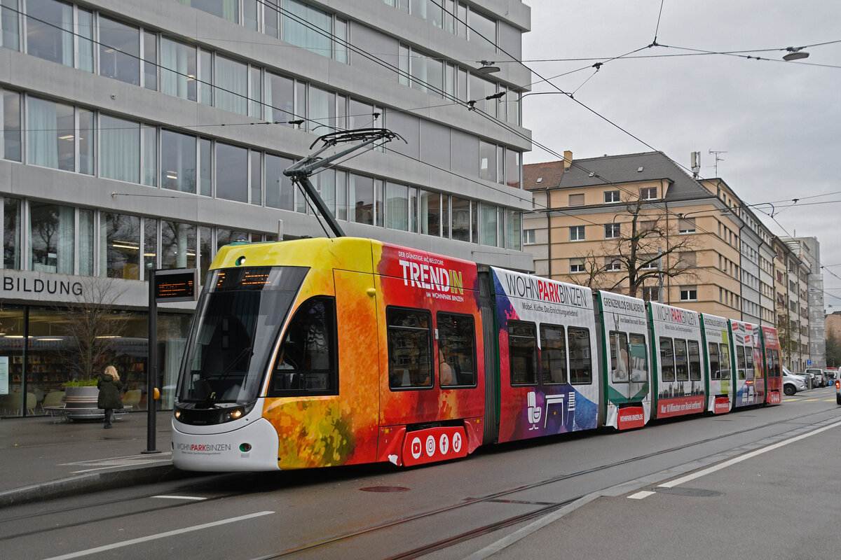 Be 6/8 Flexity 5003 mit der Werbung für den Wohnpark Binzen, auf der Linie 2, bedient am 08.12.2025 die Haltestelle Gewerbeschule. Aufnahme Basel.