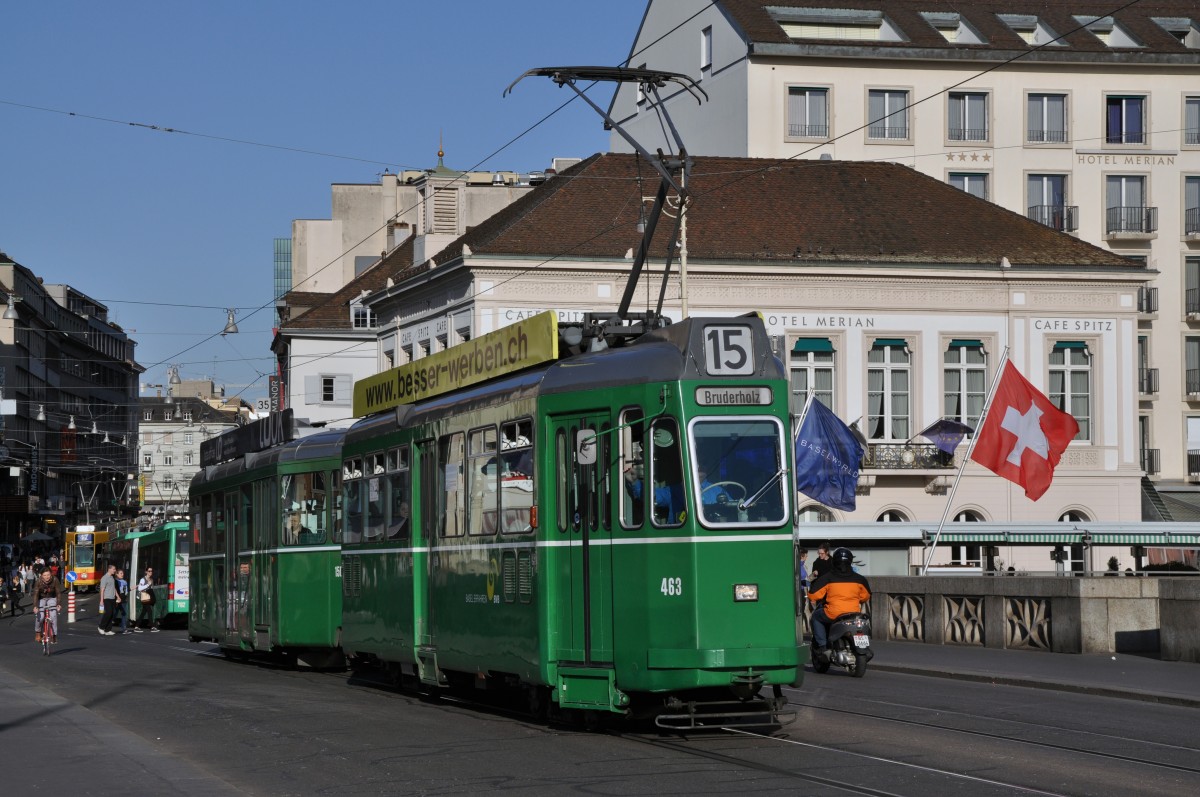 Be 4/4 463 und der B 1503 S auf der Linie 15 bei der Mittleren Rheinbrücke.