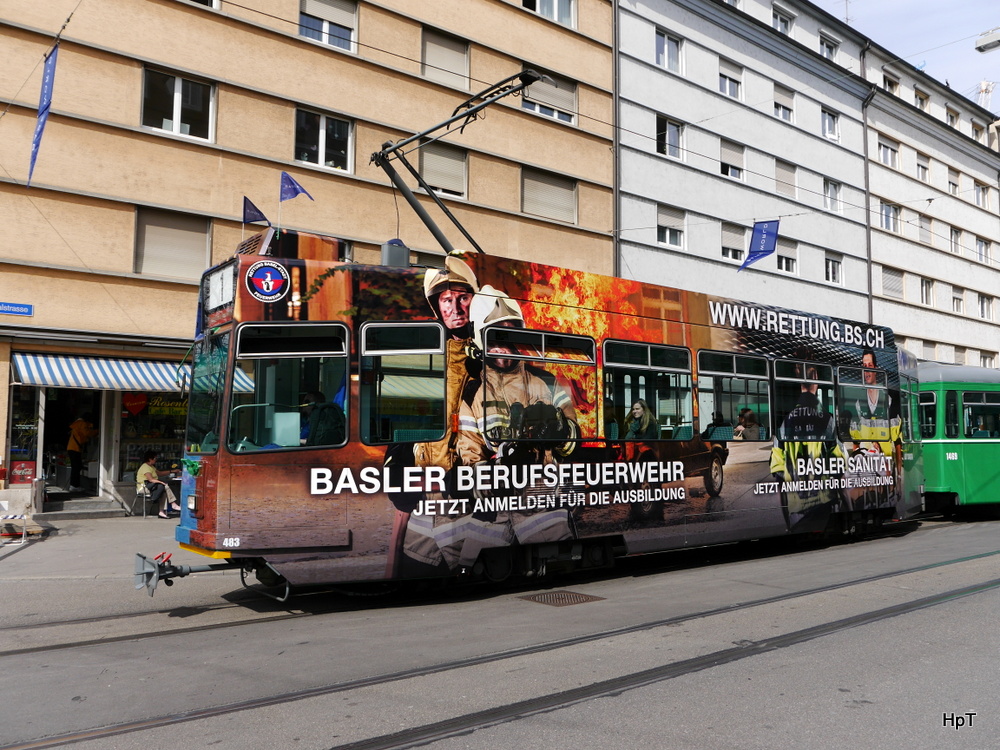 BVB Basel - Tram Be 4/4 483 unterwegs auf der Linie 1 in der Stadt Basel am 29.03.2014