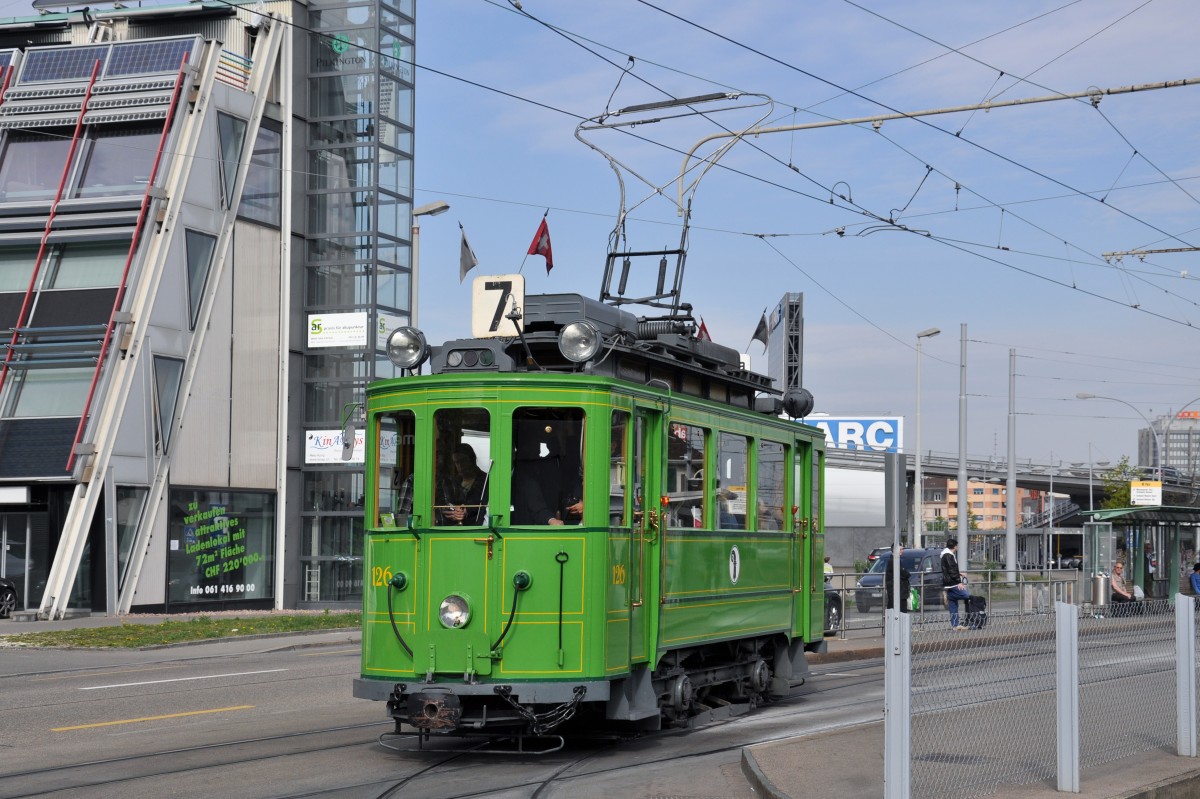 Mit dem Be 2/2 126 aus dem Jahre 1908 finden Publikumsfahrten durch die Stadt Basel statt. Hier kommt der Wagen zum Depot Dreispitz zurück. Die Aufnahme stammt vom 12.04.2014.