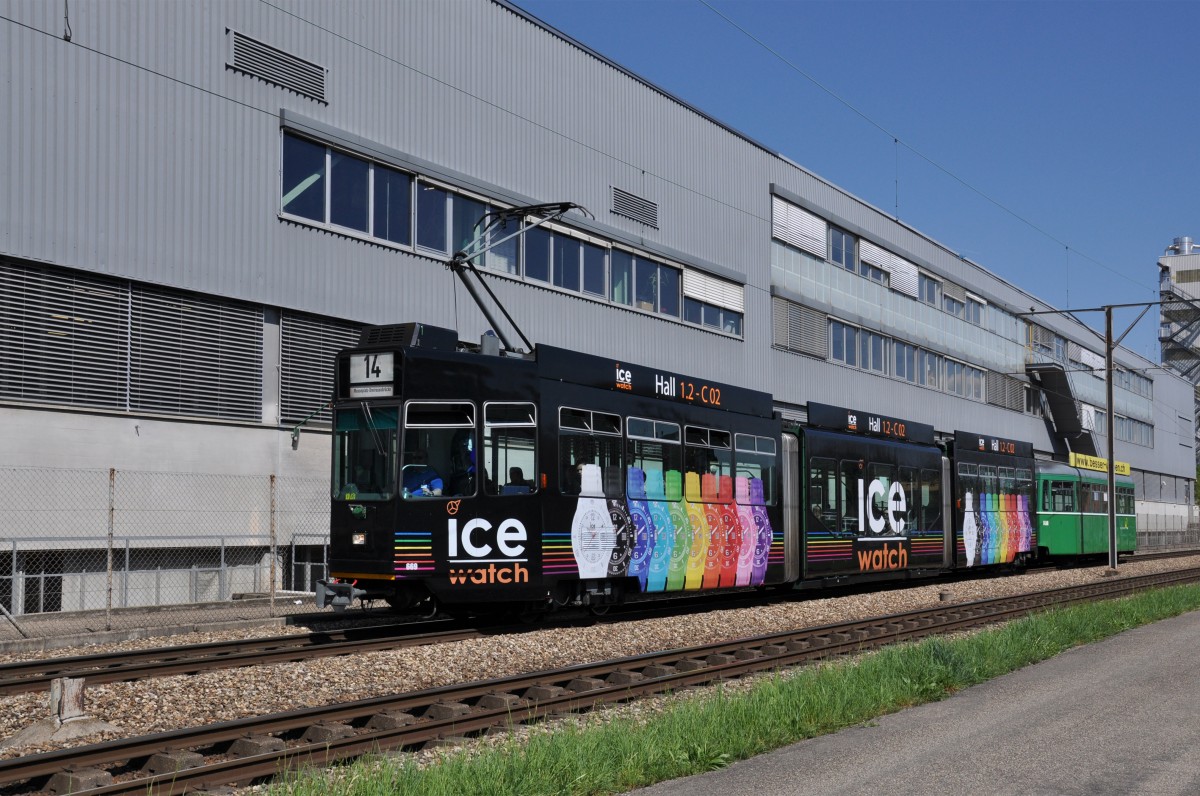 Be 4/6S 669 mit der Werbung für ICE Uhren zusammen mit dem B 1458 bei der Haltestelle Kästeli. Die Aufnahme stammt vom 09.04.2014.