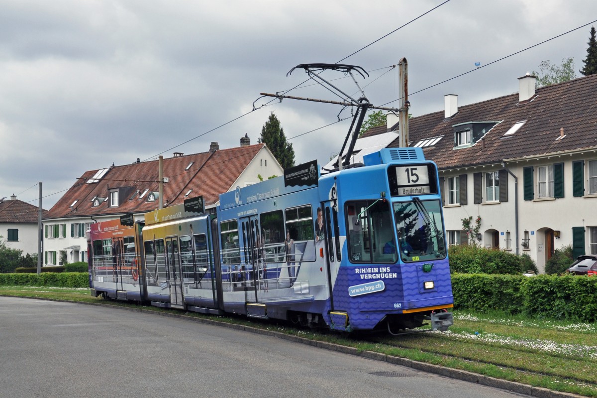 Be 4/6S 662 mit der Werbung für die Basler Personenschifffahrt auf der Linie 15/16 kurz vor der Haltestelle Studio Basel. Die Aufnahme stammt vom 29.04.2014.