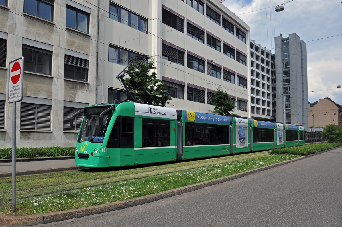 Seit dem 03.06.2014 hat der Combino 301 eine Teilwerbung der Basler Kantonalbank. Hier fährt der Wagen auf der Linie 6 zur Haltestelle Gewerbeschule. Die Aufnahme stammt vom 03.06.2014.