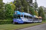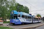 Seit dem 25.05.2014 trägt der Be 4/4 502 eine Werbung für die SCPOE-Art Ausstellung. Hier fährt der Wagen zusammen mit dem B 1505 S und dem B 1455 auf der Linie 14 am Aeschenplatz. Die Aufnahme stammt vom 27.05.2014.