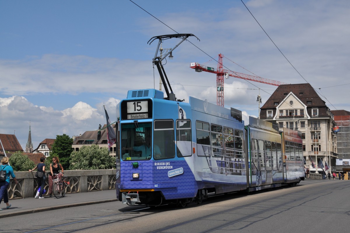 Be 4/6 S 662 mit der Werbung für die Basler Personenschifffahrt überquert die Mittlere Rheinbrücke. Die Aufnahme stammt vom 28.05.3014.