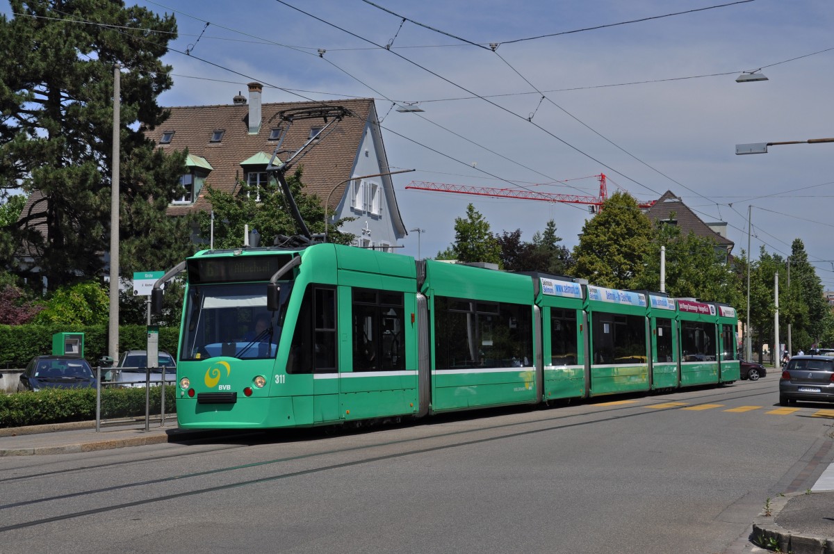 Be 6/8 Combino 311 bedient auf der Linie 6 die Haltestelle Kirche. Die Aufnahme stammt vom 06.06.2014.