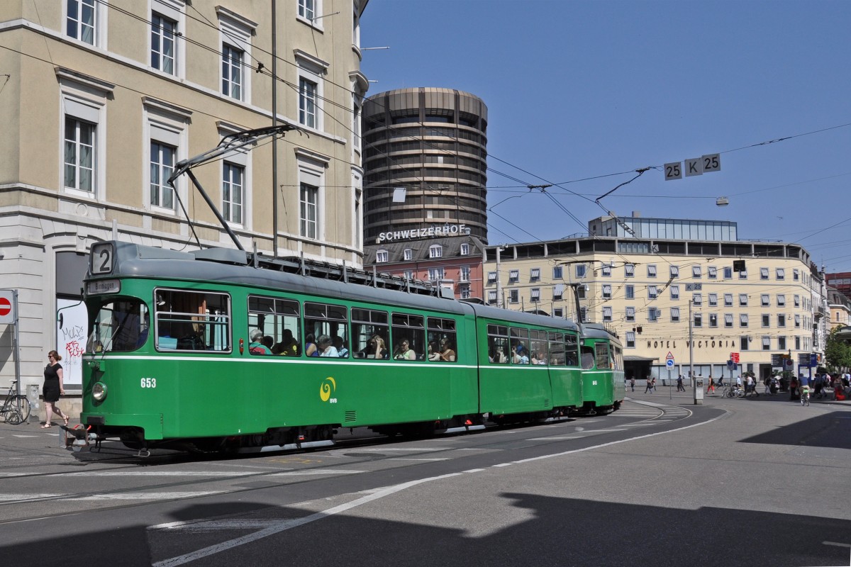 Be 4/6 653 zusammen mit dem Be 4/6 645 auf der Linie 2 beim Bahnhof SBB. Die Aufnahme stammt vom 10.06.2014.