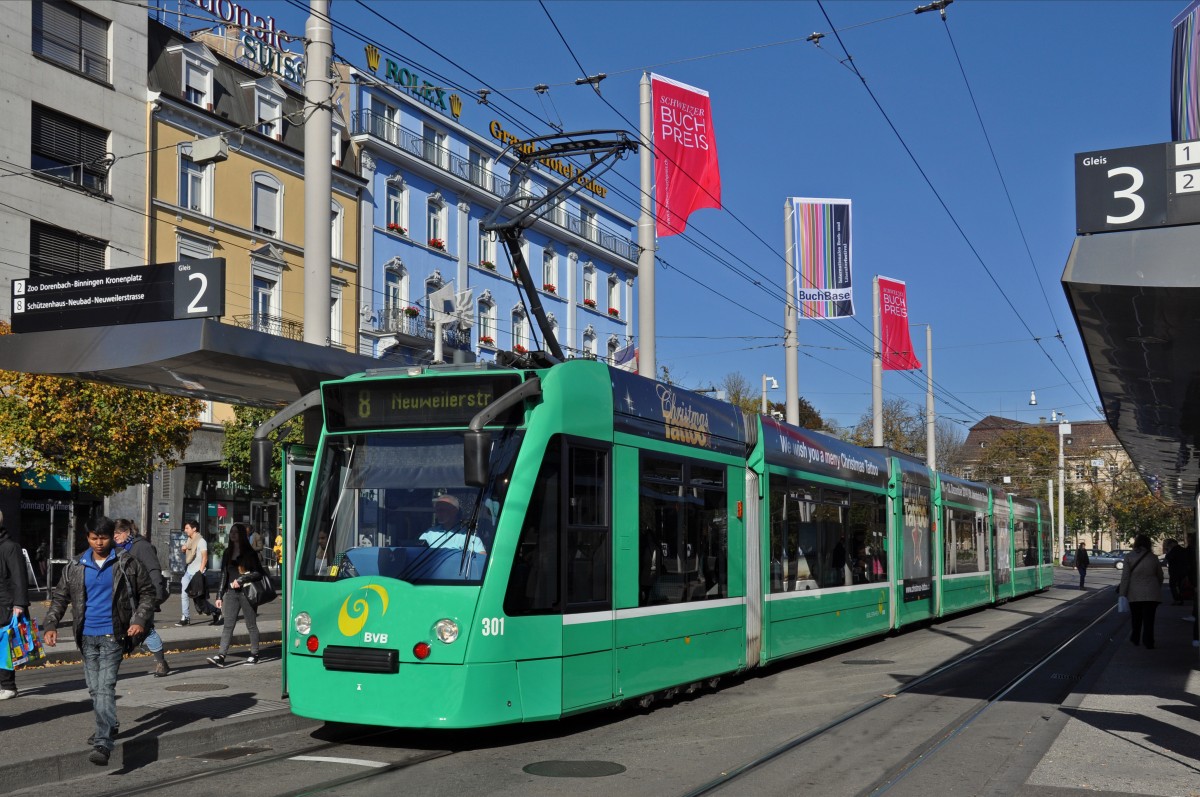 Be 6/8 Combino 301 trägt seit dem 28.10.2014 eine Teilwerbung für das Christmas Tattoo 2014. Hier steht der Wagen an der Haltestelle Bahnhof SBB. Die Aufnahme stammt vom 31.10.2014.