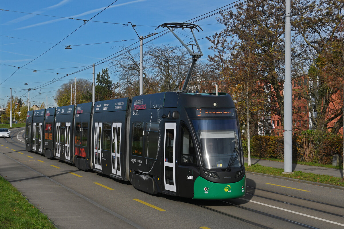 Dreiwagenzug mit dem Be 4/4 497 an der Spitze auf der Linie 3 kurz vor der Haltestelle Salinenstrasse. Die Aufnahme stammt vom 10.02.2015.