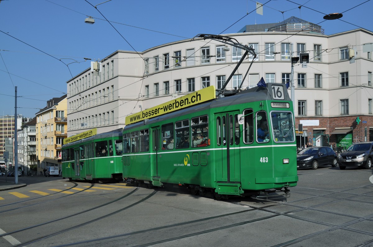 Be 4/4 463 zusammen mit dem B 1480 S auf der Linie 16 fahren zur Haltestelle Marktplatz. Die Aufnahme stammt vom 13.03.2015.