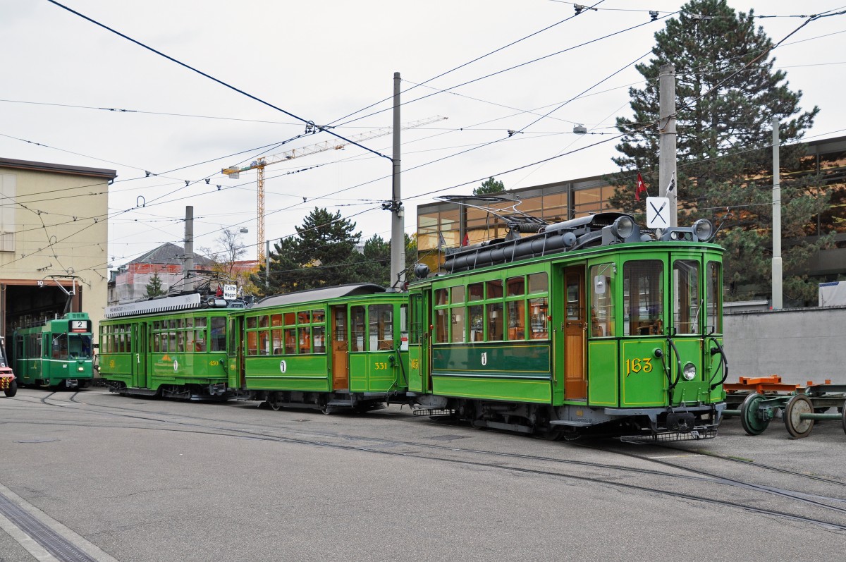 Oldtimer Parade auf dem Hof der Hauptwerkstatt: Vorne der Be 2/2 163, dahinter der B2 331 und am Schluss die Alte Dame Dante Schuggi, die hoffentlich bald wieder im Einsatz stehen wird. Die Aufnahme stammt vom 22.10.2015.