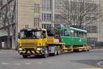 Nun ist der Be 4/4 460 an der Reihe. Am 18.12.2015 wird er in der Hauptwerkstatt aufgeladen und tritt die letzte Reise an. Hier steht der Lastwagen auf dem Hof der Hauptwerkstatt.