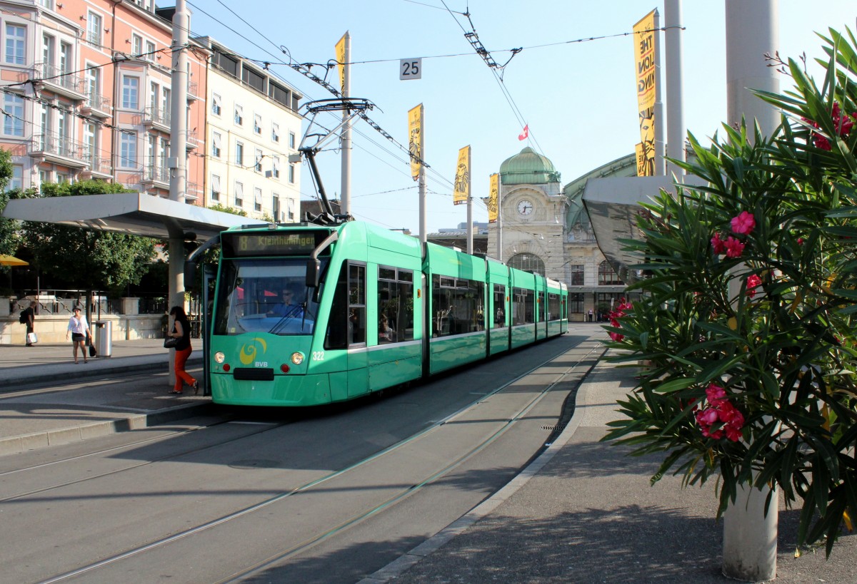Basel BVB Tram 8 (Siemens-Combino Be 6/8 322) Centralbahnplatz / Bahnhof SBB am 4. Juli 2015.