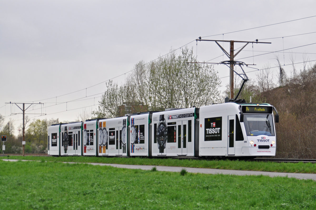 Be 6/8 Combino 319, mit einer Tissot Uhren Werbung, auf der Linie 14, fährt zur Haltestelle Lachmatt. Die Aufnahme stammt vom 08.04.2016.