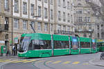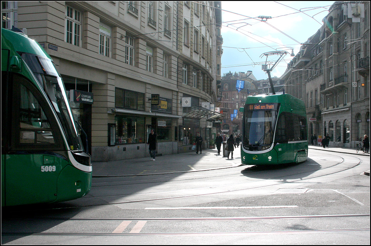 An der Schifflände in Basel begegnen sich zwei Flexity 2-Trams.
