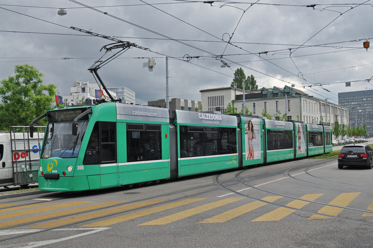 Be 6/8 Combino 306, mit einer Teilwerbung für Calzedonia, fährt zur Haltestelle der Linie 1 am Voltaplatz. Die Aufnahme stammt vom 24.05.2016.