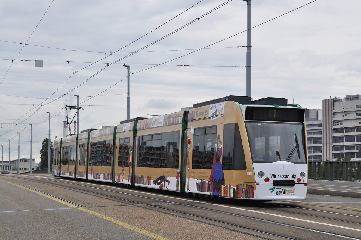 Be 6/8 Combino 319, mit einer Thalia/Orelfüssli Werbung, überquert die Dreirosenbrücke.