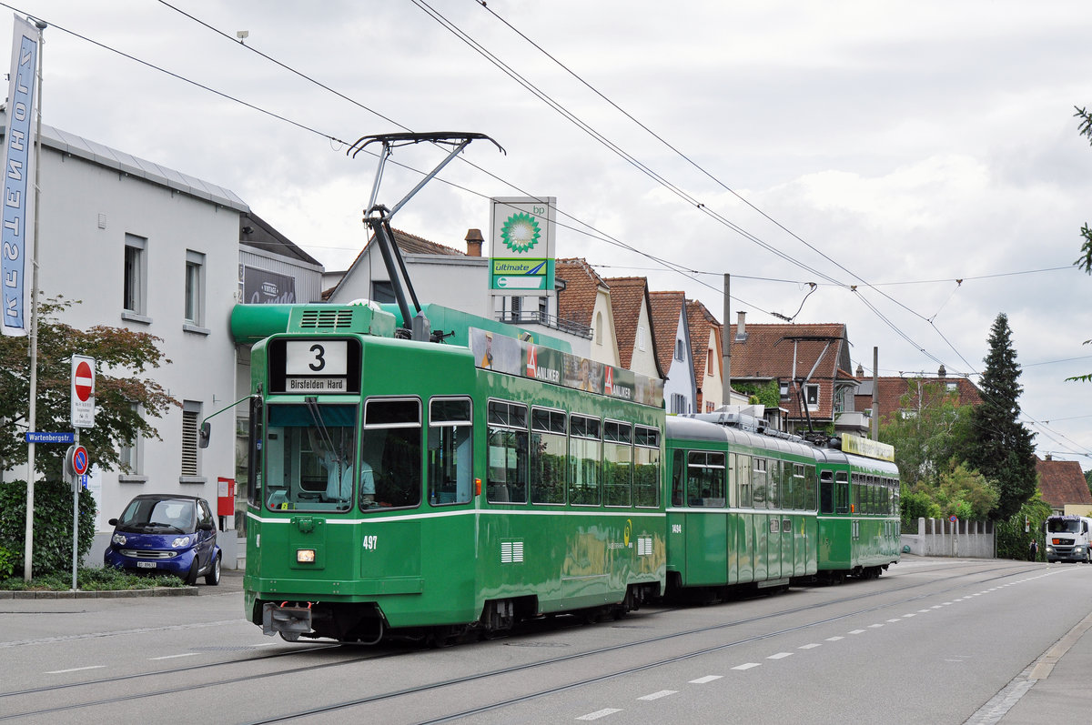 Be 4/4 497zusammen mit dem B 1494 S und dem Be 4/4 467, auf der Linie 3, fährt zur Endstation in Birsfelden. Die Aufnahme stammt vom 30.06.2016.