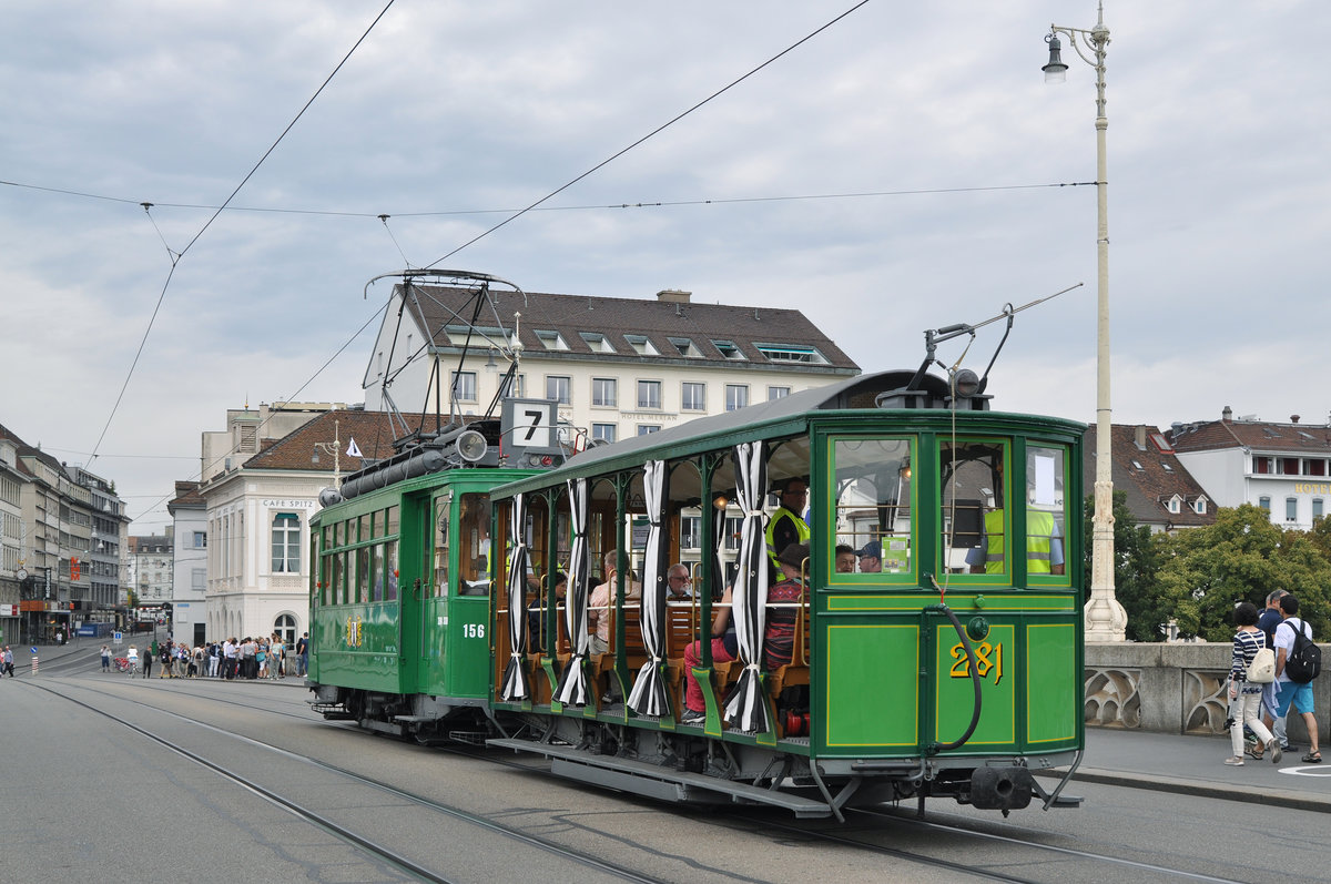 Am 04.09.2016 wurde zum ersten mal die neue Museumslinie 7 gefahren. Die Strecke führt vom M-Parc (Depot Dreispitz, wo auch das neue Trammuseum entstehen soll), via Peter Merian, Bahnhof SBB, Aeschenplatz, Barfüsserplatz, Schifflände, Claraplatz, Messeplatz zum Badischen Bahnhof und dann zur Endstation am Eglisee. Hier überquert der Be 2/2 156 zusammen mit dem Sommerwagen B2 281 die Mittlere Rheinbrücke.