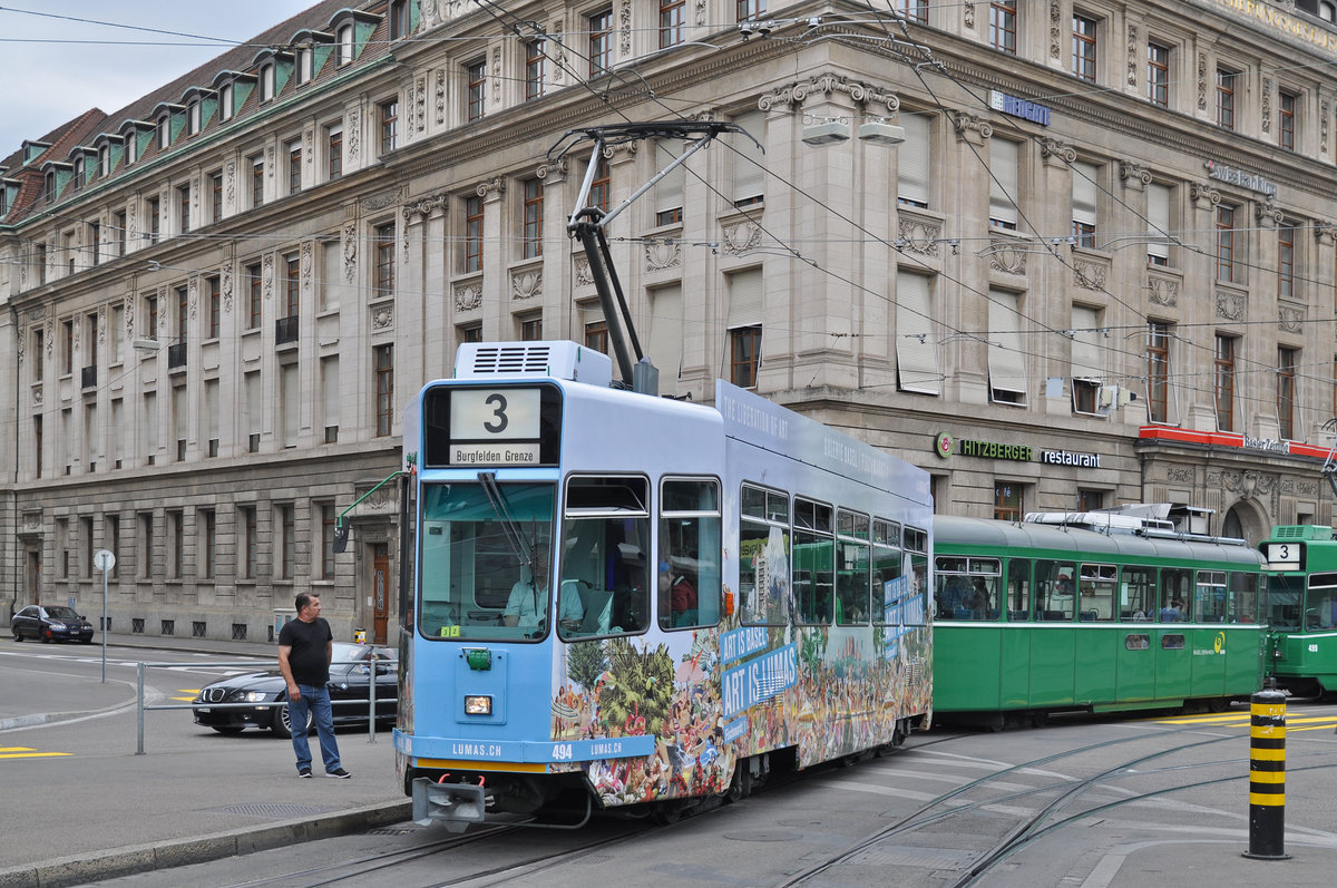 Be 4/4 494, mit einer Werbung für die Galerie Lumas, fährt zur Haltestelle der Linie 3 am Aeschenplatz. Die Aufnahme stammt vom 04.09.2016.