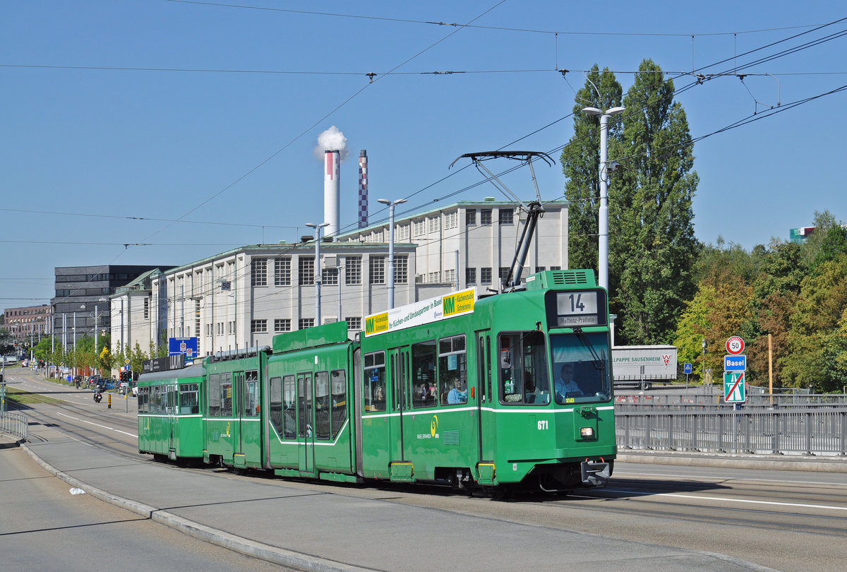Be 4/6 S 671 zusammen mit dem B 1478, auf der Linie 14, verlassen die Haltestelle Novartis Campus. Die Aufnahme stammt vom 07.09.2016.