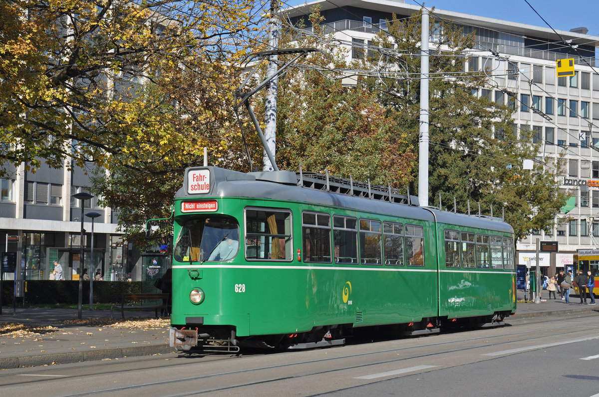 Be 4/6 Düwag 628 ist mit der Fahrschule unterwegs. Hier verlässt der Wagen die Haltestelle am Aeschenplatz. Die Aufnahme stammt vom 02.11.2016.