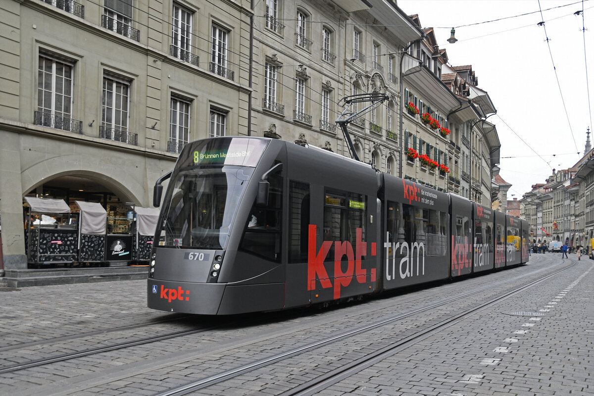 Be 6/8 Combino 669 mit der Werbung für die Lindenhofgruppe, gratuliert dem SC Bern für den Schweizermeistertitel im Eishockey. Hier bedient der Combino auf der Linie 8 die Haltestelle Bärenplatz. Die Aufnahme stammt vom 25.06.2019.