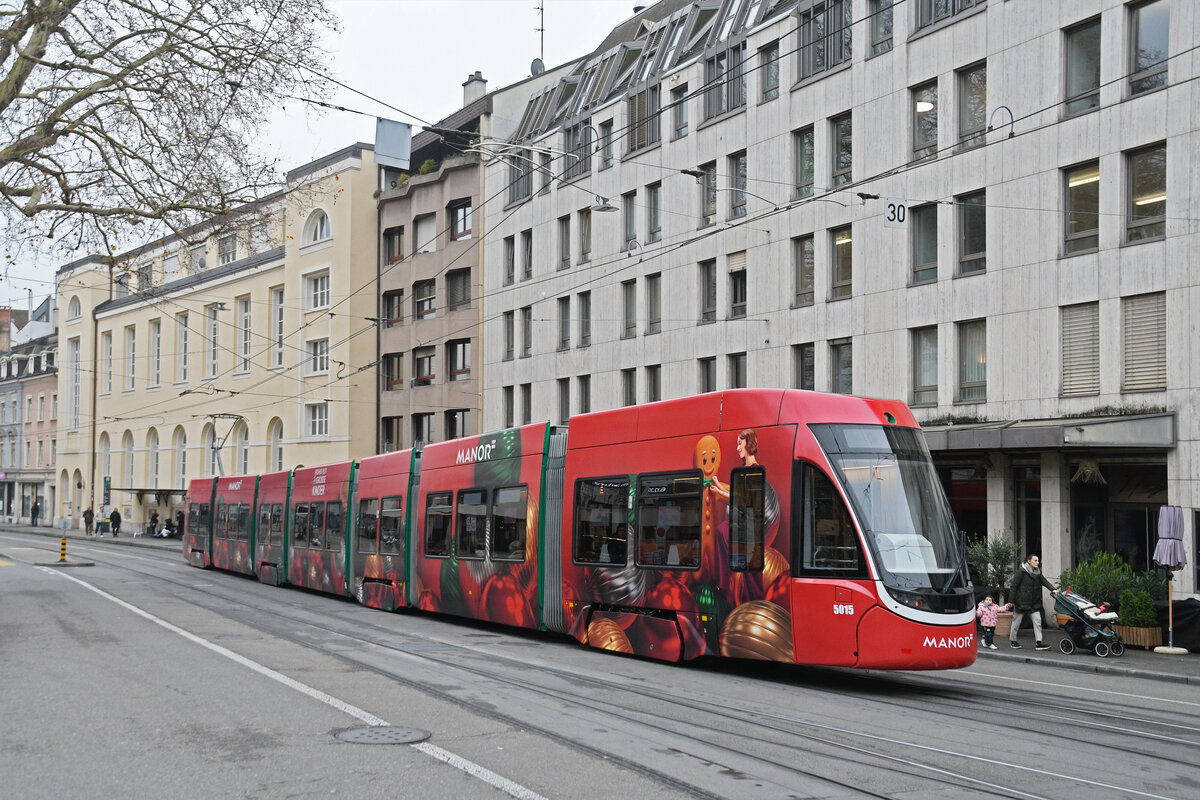 Be 6/8 Flexity 5022 mit der Werbung für die Zürich Versicherung, auf der Linie 6, überquert am 11.11.2025die Mittlere Rheinbrücke. Aufnahme Basel.