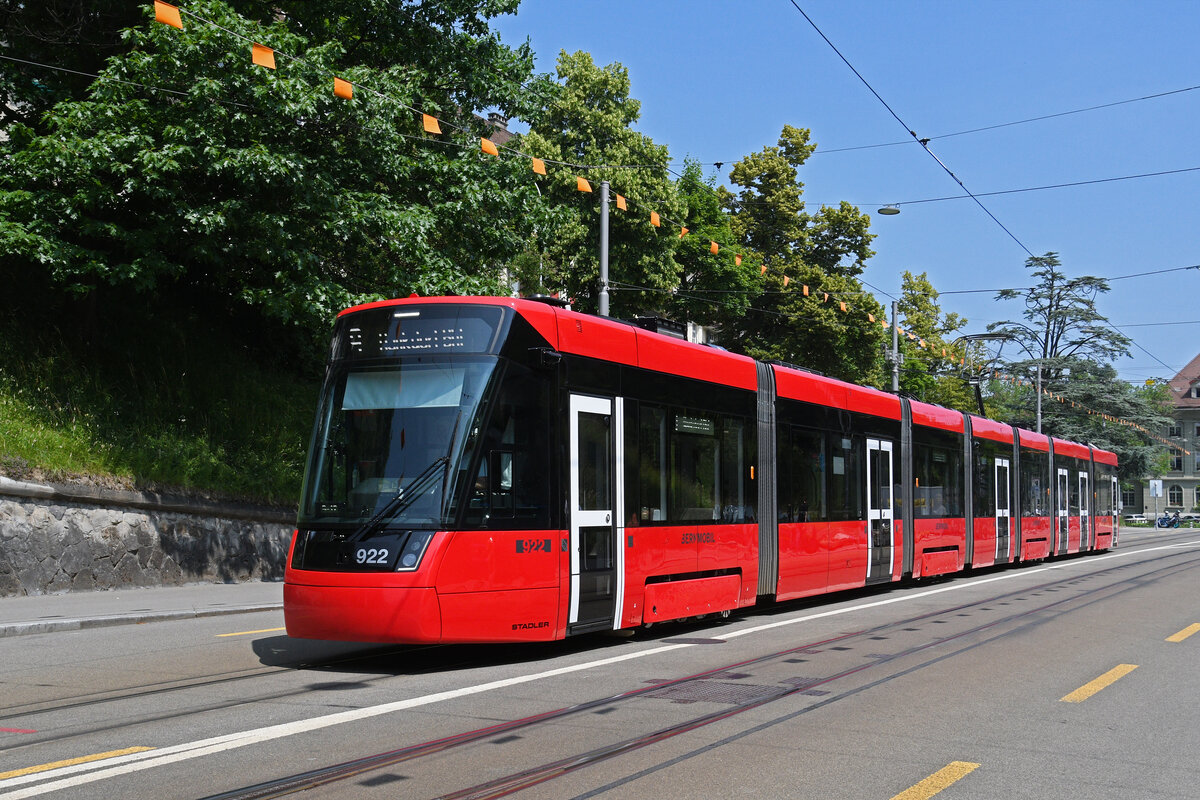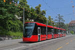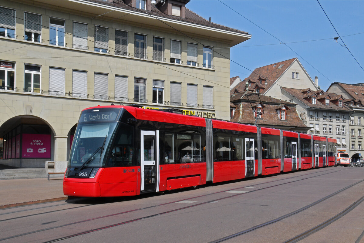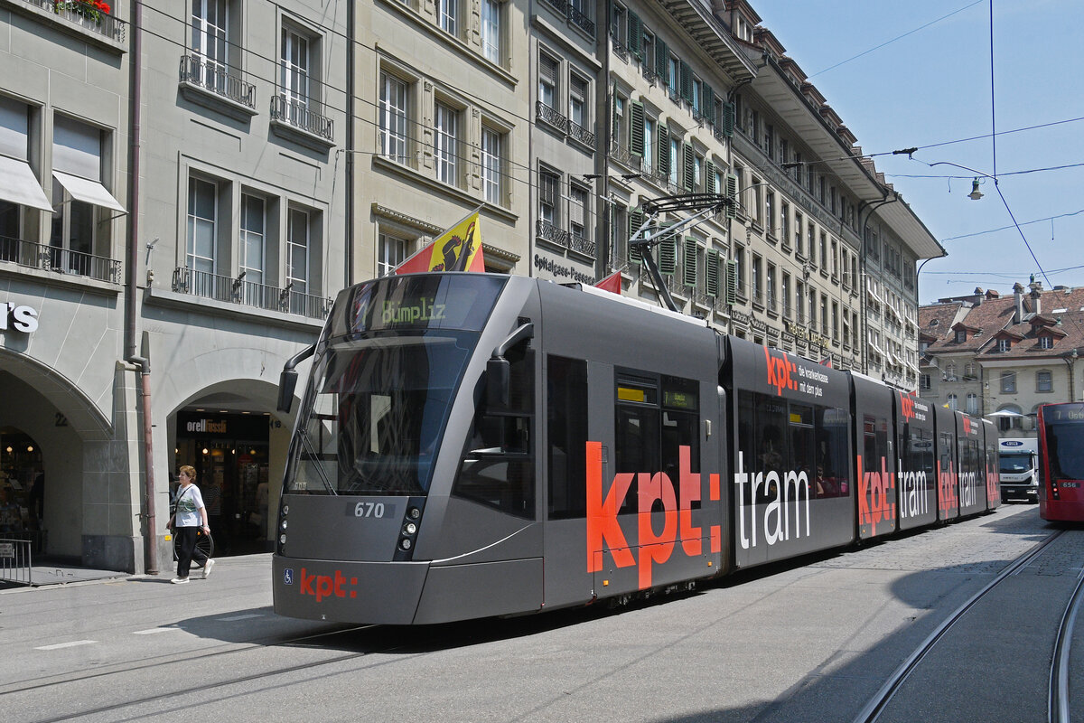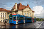 Be 6/8 Combino 671, auf der Linie 8, fährt am 11.06.2025 bei der Haltestelle Zytglogge beim Casinoplatz ein. Aufnahme Bern.