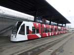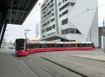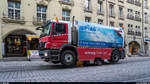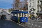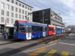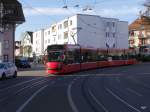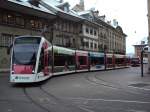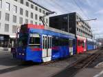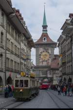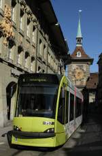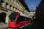 Bern Mobil mit dem Tram Be 6/8 653 unterwegs auf der Linie 8 in der Marktgasse mit Endstation Brünnen Westside Bhf. am 22.04.2015. Im Hintergrund die berühmte Zytologge.