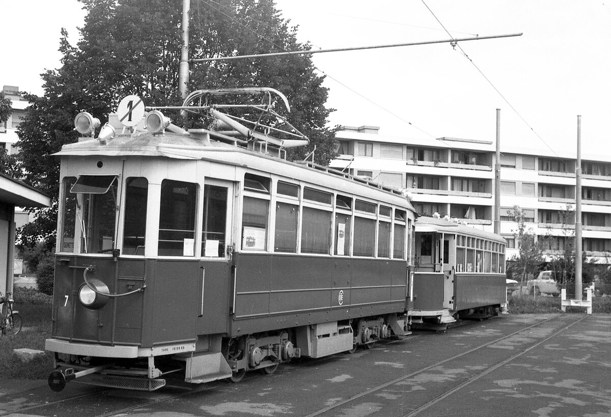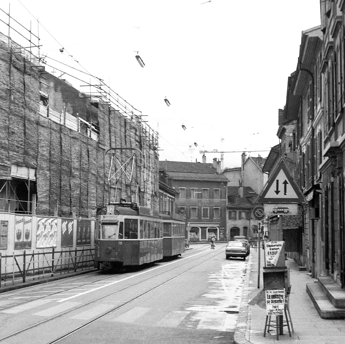 Genf Tram__Zug der Linie 12 bei der Haltestelle 'Chêne-Bourg Poste' mit Bw 304 [Schweizer Standardwagen 50er Jahre].__31-08-1976
