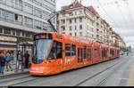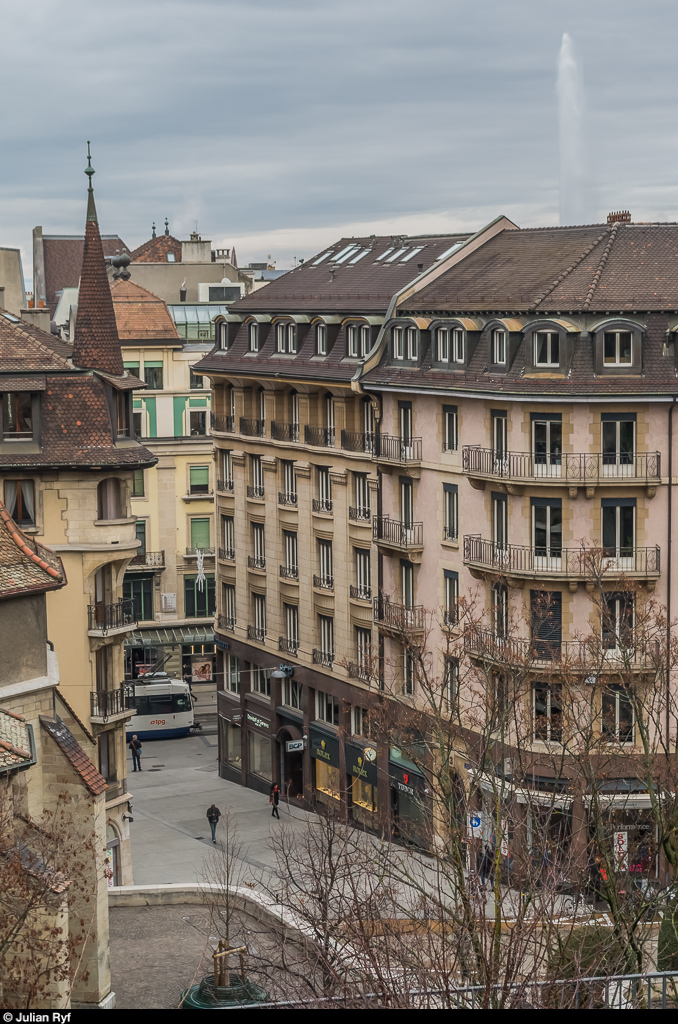 Tram-Suchbild. TPG Vevey-Tram auf der Linie 12 zwischen Molard und Rive am 6. Februar 2017. Im Hintergrund über den Dächern der Jet d'Eau, das Wahrzeichen von Genf.