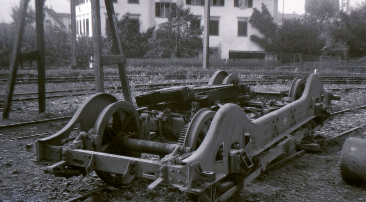Strassenbahn Schwyz - Brunnen: Wagen 1 in der Innenstadt von Schwyz, Herbst 1963.