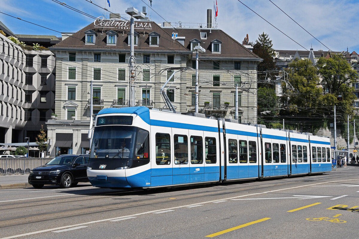 Be 5/6 Cobra 3004, auf der Linie 3, überquert am 22.08.2024 die Bahnhofbrücke in Zürich.