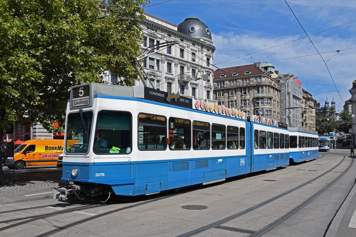 Doppeltraktion, mit dem Be 4/6 2076 und dem Be 2/4 2416, auf der Linie 5, bedient am 22.08.2024 die Haltestelle Bellevue. Aufnahme Zürich.